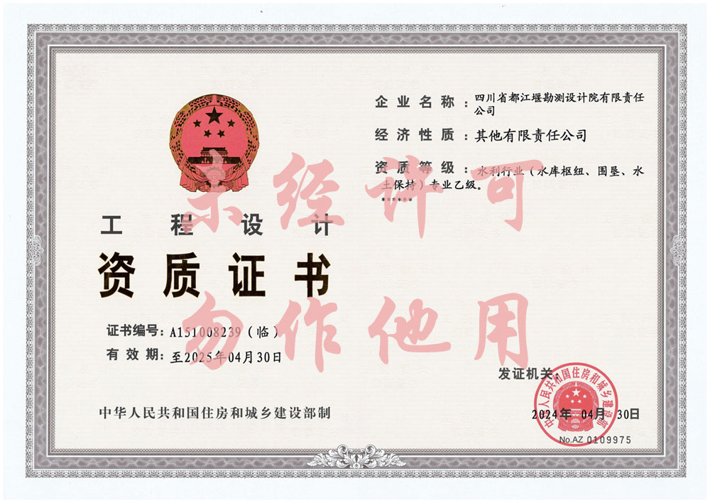 四川省都江堰勘測設計院有限責任公司是一家專業從事水利水電工程勘察設計的專業甲級設計院,目前具有水利行業(灌溉排澇)專業甲級、水利行業(引調水、河道整治、城市防洪)專業乙級、電力行業(水力發電(含抽水蓄能、潮汐))專業乙級、市政行業(道路工程、橋梁工程)專業乙級、水利行業(水庫樞紐、圍墾、水土保持)專業丙級設計資質、工程勘察專業類(巖土工程、水文地質、工程測量)乙級資質和水利工程咨詢、項目管理丙級資質,通過了ISO9001:2008質量體系國際標準認證。 通過30多年的發展,公司已經擁有一支愛崗敬業、專業精湛、分工明確、協作配合的專業技術隊伍和高水平的顧問團隊,有完善的組織機構、優秀的管...
